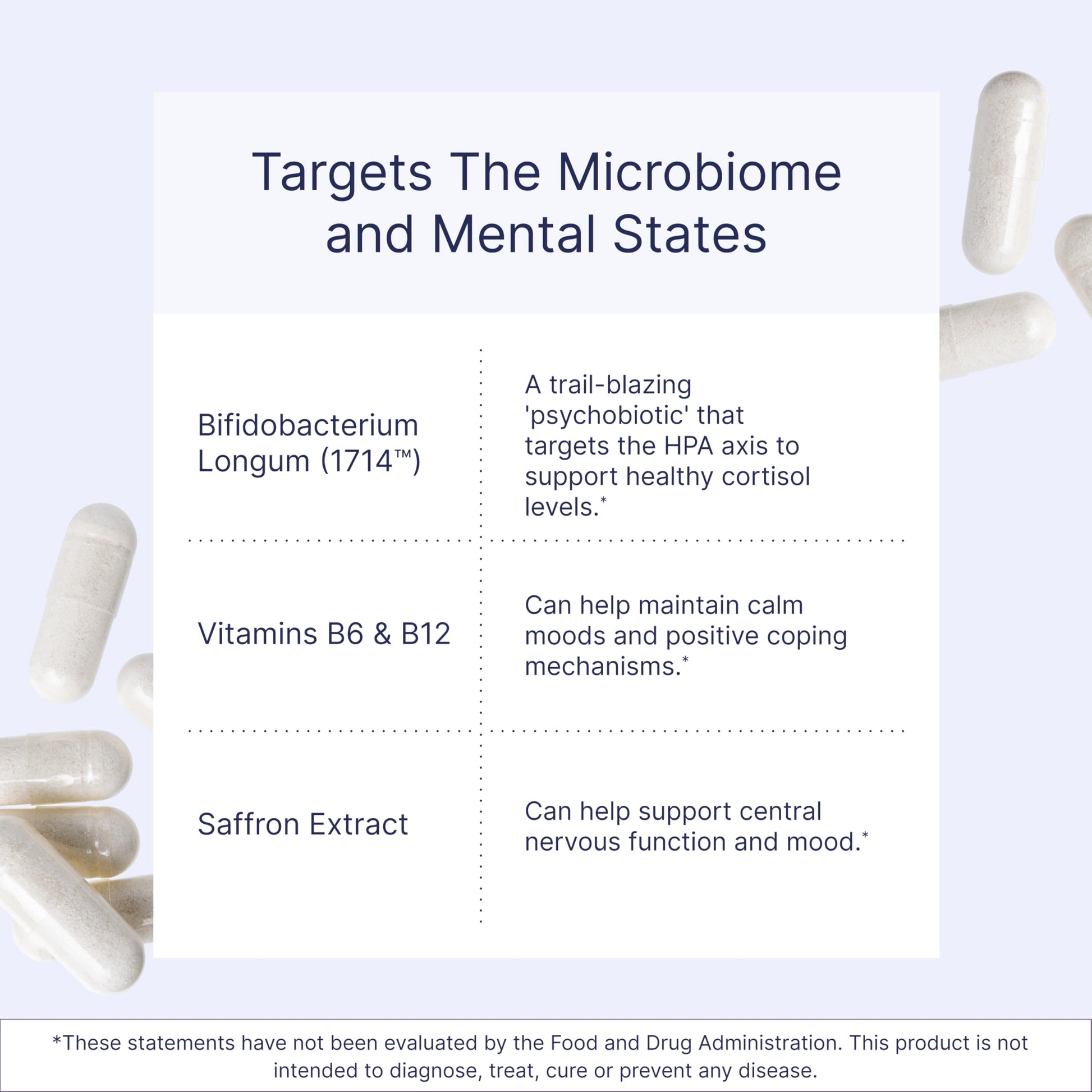 - 1714: A Trail-blazing Psychobiotic - In a 4-week human trial, Bifidobacterium longum 1714 probiotic reduced perceived stress, improved memory performance, reduced mental fatigue, positively supported brainwave activity, and improved ability to handle occasional stress. This bifidobacterium probiotic exerts its effect by targeting the HPA axis to support healthy cortisol levels.*