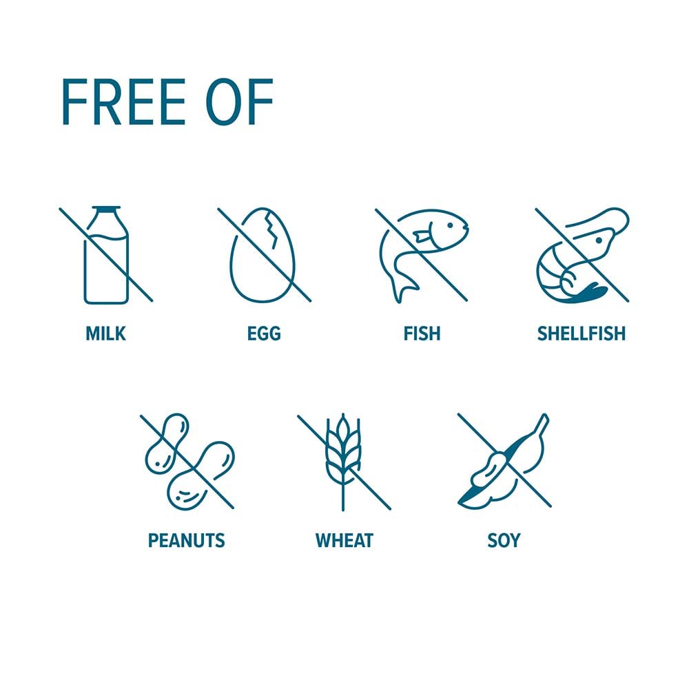 - Free from: Eggs, fish, gluten, GMO, milk, peanuts, shellfish, soy, tree nuts, wheat, artificial colors, artificial flavors, and artificial preservatives