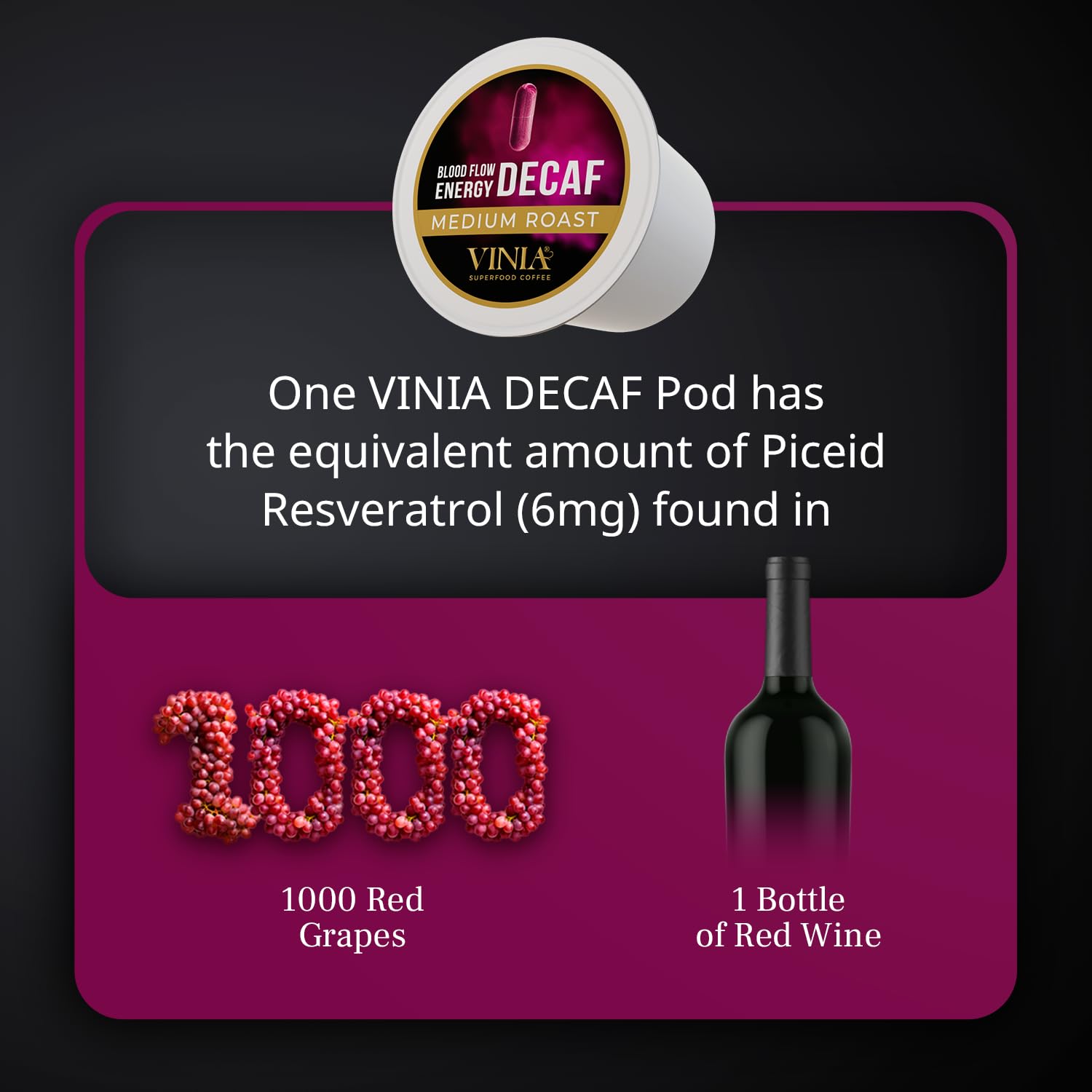 - Science Meets Coffee - Crafted by coffee connoisseurs and BioHarvest Sciences, the pioneers of game-changing cellular superfoods, VINIA caffeine free coffee pods are made with premium 100% Arabica beans and infused with a breakthrough red grape cell powder that improves physical energy and mental alertness via increased dilation of arteries and blood flow when consumed daily for 90 days.